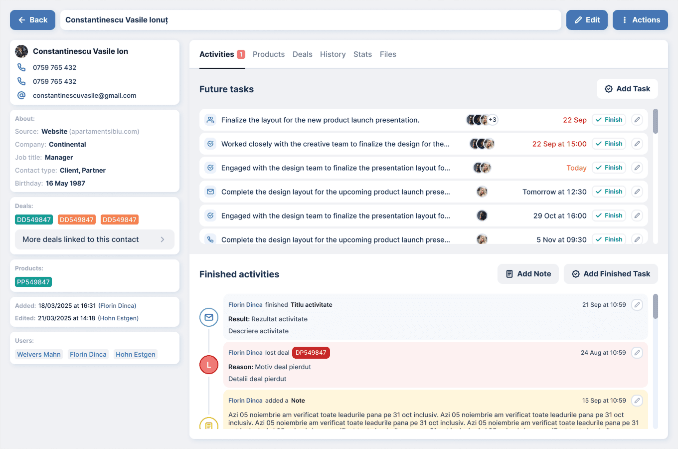 Managementul Activităților: Am creat un sistem de carduri și liste care separă „Future tasks” de „Finished activities”. Am folosit coduri de culoare pentru tipurile de interacțiune (Apel, Email, Vizionare) pentru a facilita scanarea rapidă a istoricului unui client.