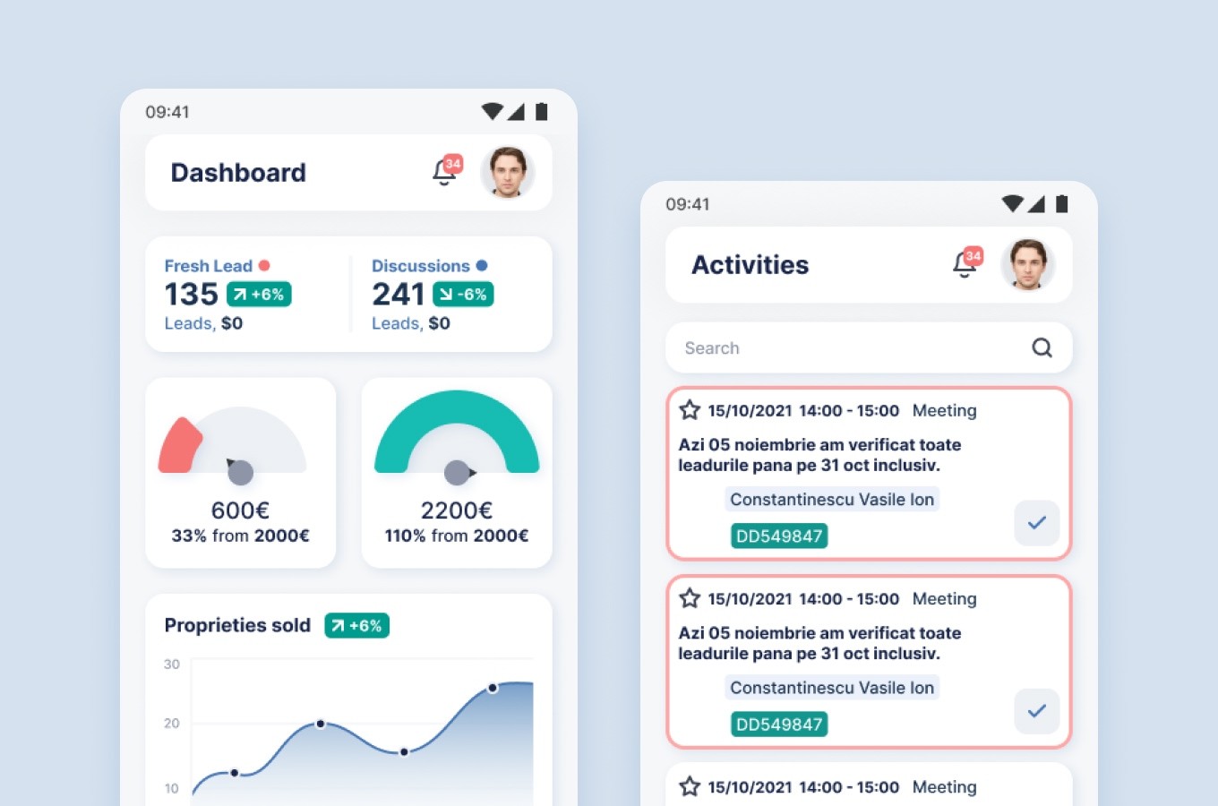 Arhitectura Dashboard-ului: Am prioritizat informația folosind widget-uri clare pentru KPI-uri esențiale (Fresh Leads, Revenue, Sold Properties). Am integrat grafice tip „gauge” și „line charts” pentru ca utilizatorul să înțeleagă dintr-o privire statusul vânzărilor.