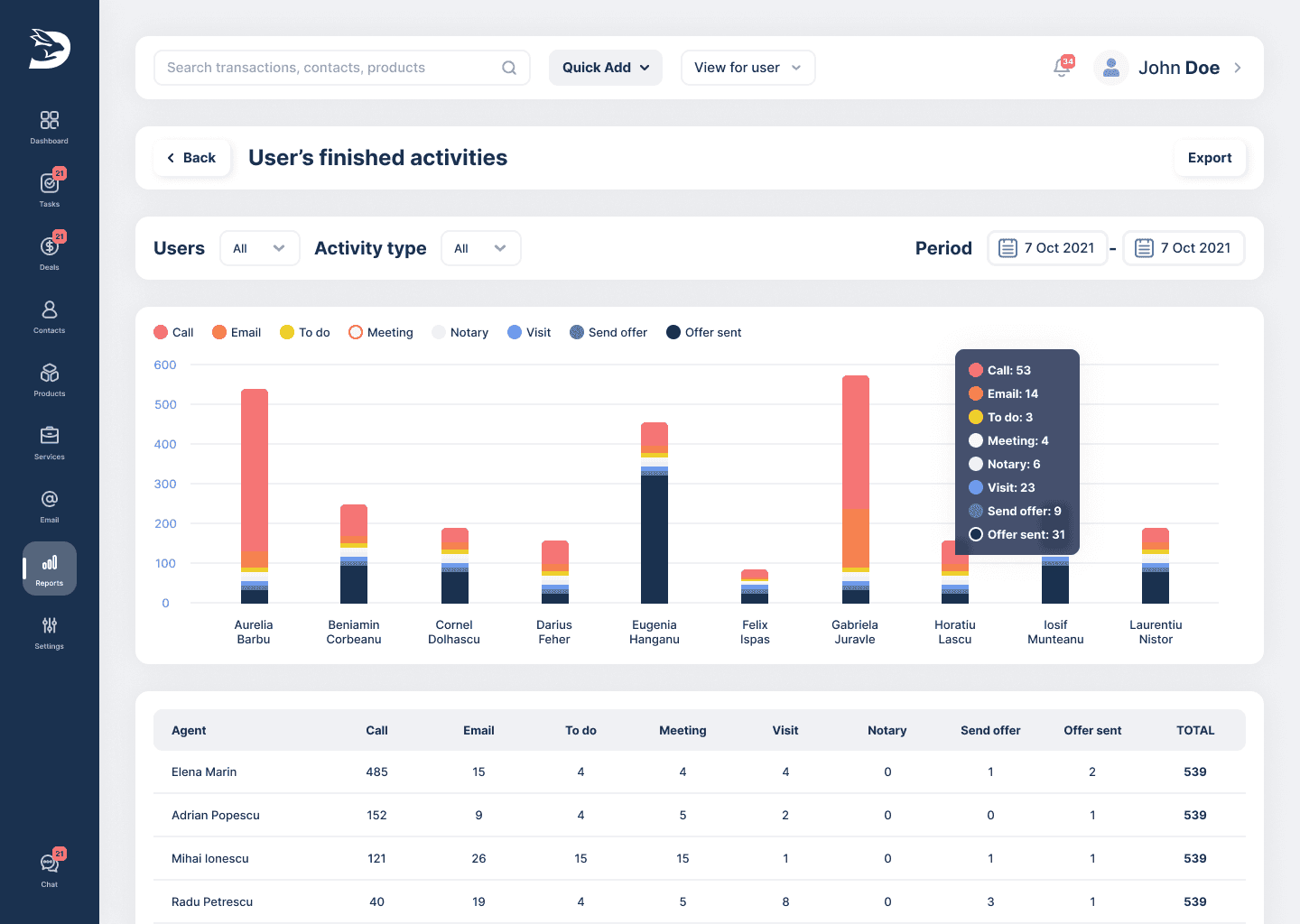 Data Visualization în Rapoarte: Secțiunea de Reports a fost gândită pentru manageri. Am implementat grafice tip „stacked bar” care permit compararea performanței agenților pe diferite tipuri de activități, totul fiind filtrabil după perioadă sau utilizator.