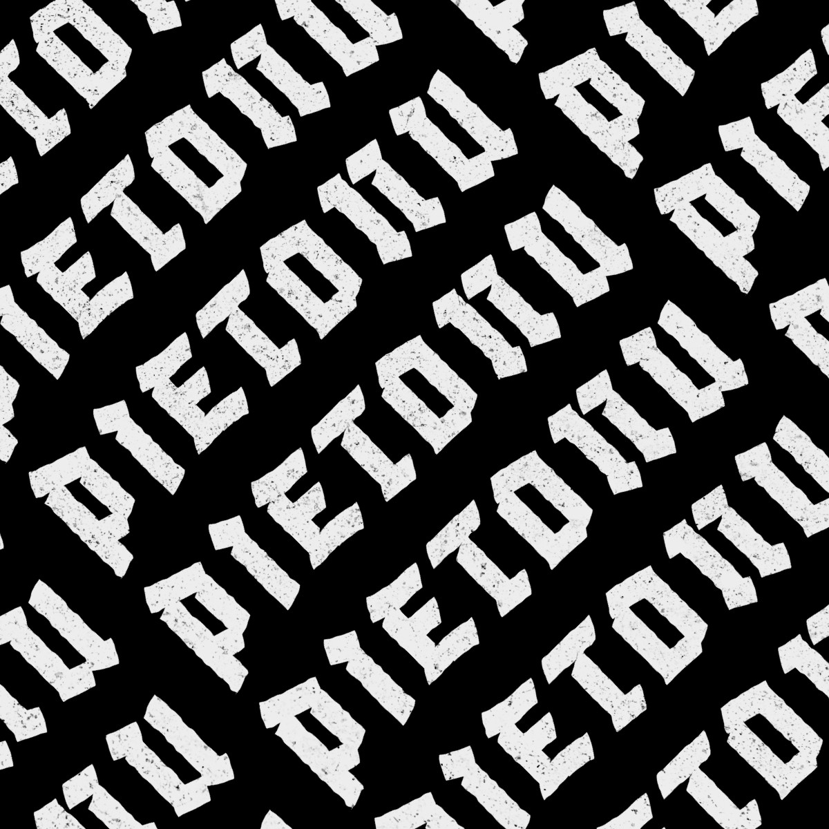 1. Tipografia (Wordmark): Elementul central este logotipul "PIETONU", realizat într-un stil Blackletter (Gotic) personalizat. Am ales acest stil deoarece evocă tradiție, rezistență și o anumită duritate specifică mediului urban. Literele sunt angulare, cu tăieturi agresive, sugerând ideea de "cioplit în piatră" sau "scris pe ziduri". Deși ornamentată, tipografia rămâne extrem de lizibilă, un aspect crucial pentru afișele de concert și merchandise.