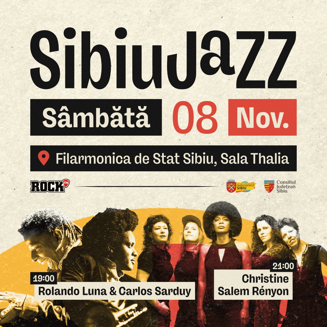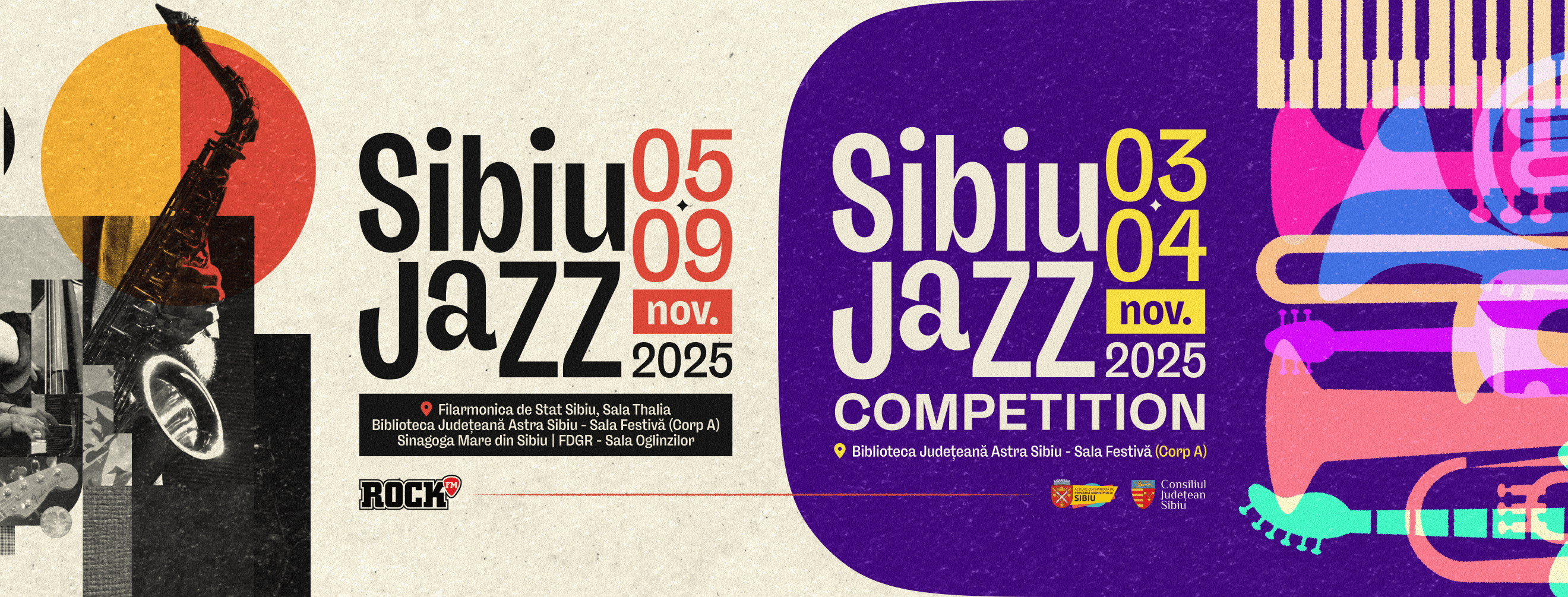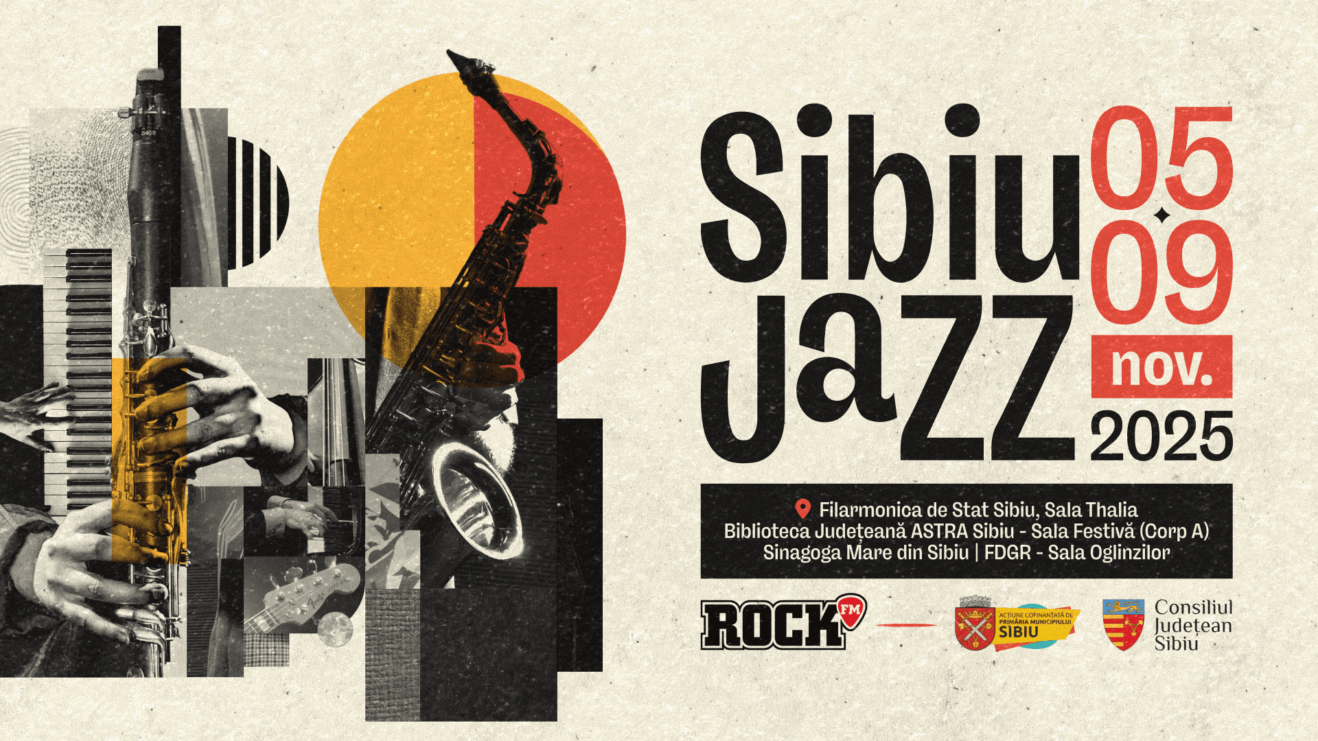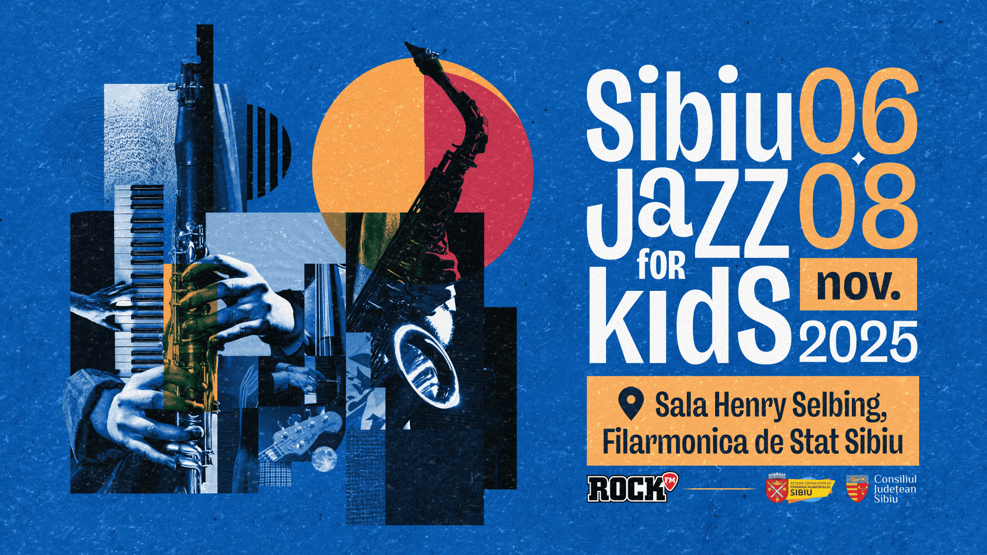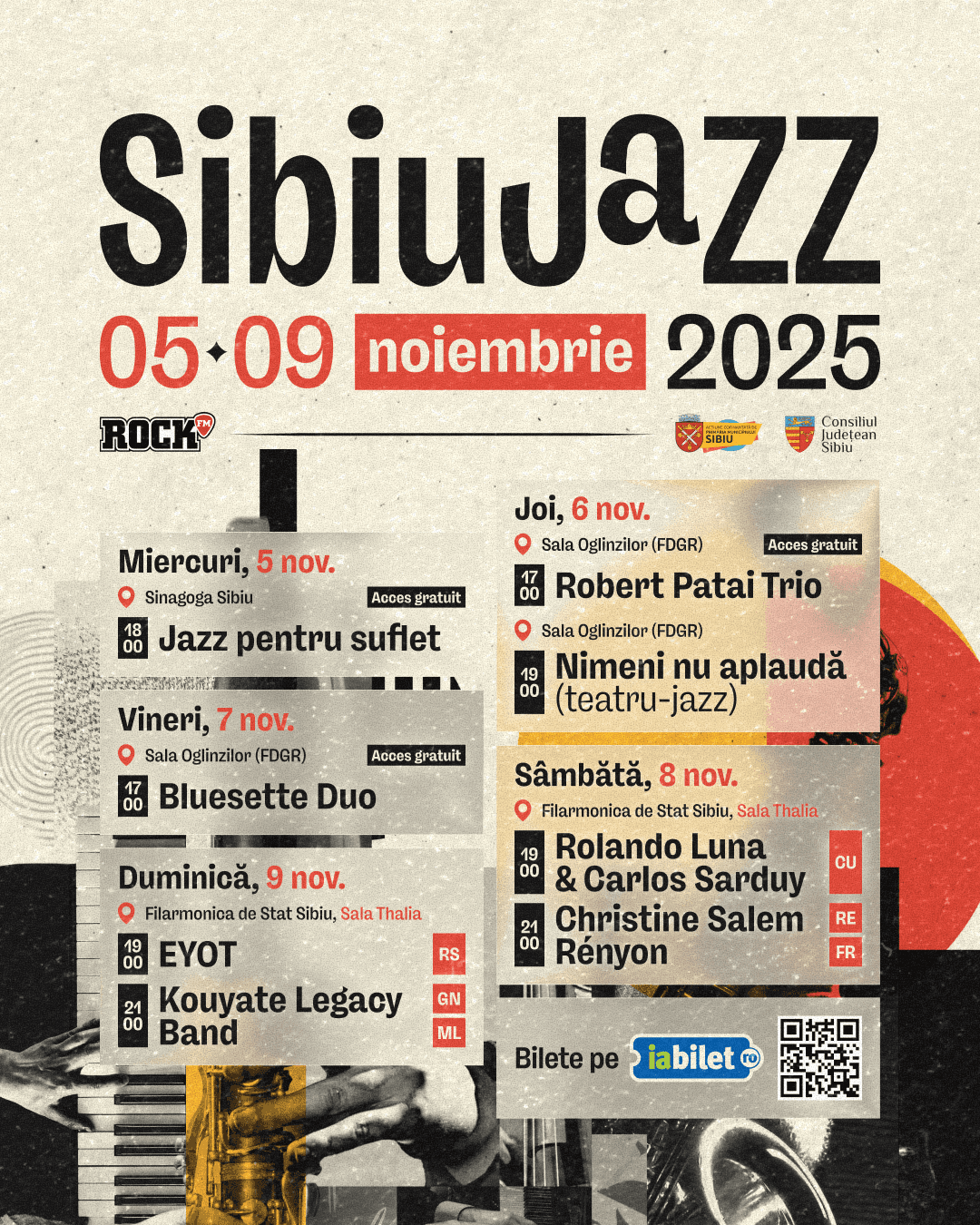 Conceptul vizual: Am ales tehnica colajului digital pentru a sugera improvizația. Am combinat fotografii texturate cu instrumente muzicale (saxofon, clape, contrabas) și elemente geometrice simple (cercuri și linii), care ghidează ochiul către informațiile esențiale.